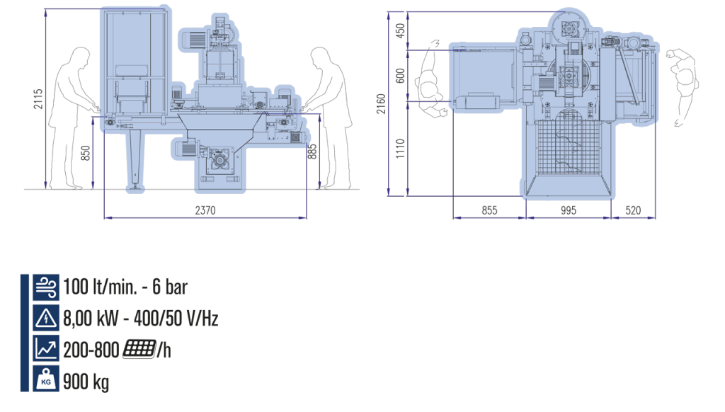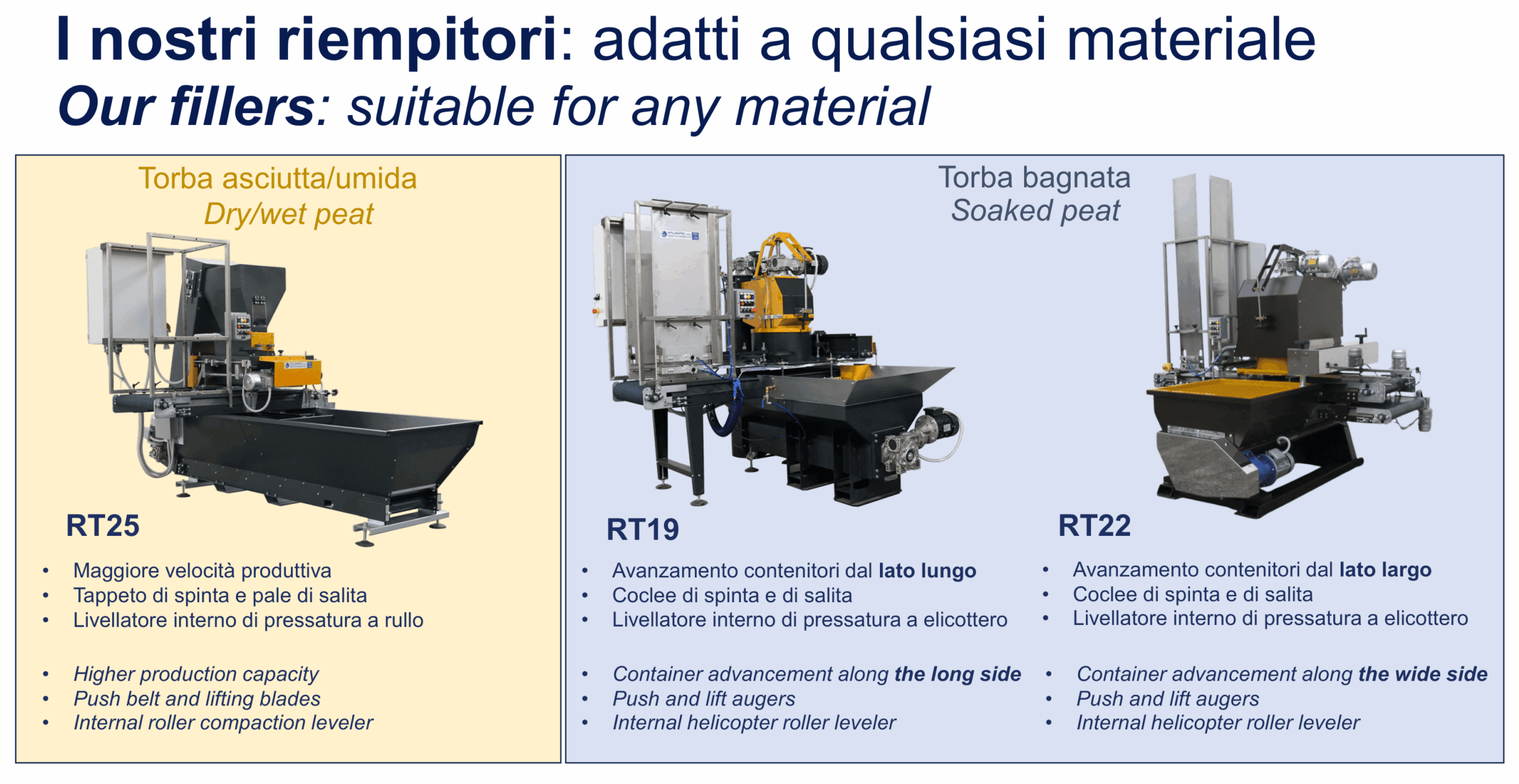 RT19 e RT22 sono due macchine simili tra loro, con gli stessi obiettivi di contenitori con torba bagnata e pressata, ma con capacità produttive differenti: RT19, infatti, ha una produttività più limitata, processando il contenitore e trasportandolo nel senso della lunghezza, mentre RT22 risponde alle esigenze dei vivai che richiedono una maggior resa in termini di vassoi/ora, trasportando il contenitore per il largo.