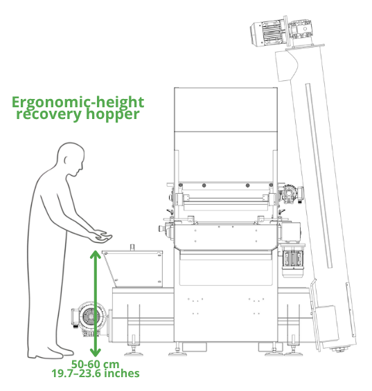 The solution proposed by Atlantic Man. involves the use of a recovery hopper positioned directly under the covering unit, at an ergonomic height of approximately 50–60 cm (19.7–23.6 inches). This allows the operator to refill the product in a simple, safe, and controlled way, minimizing physical effort and improving workplace ergonomics.